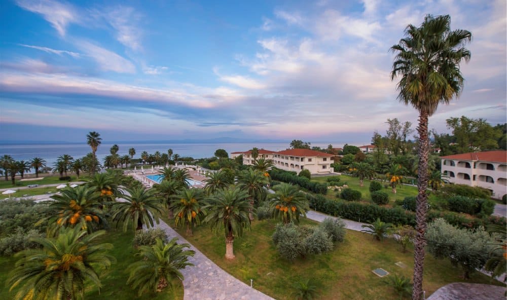 Отельный комплекс находится в 300 метрах от пляжа Ханиоти в регионе Халкидики в живописной деревне Афитос. Море здесь чистое и прозрачное, а волны в основном бывают до обеда. Здесь можно заняться дайвингом и сноркелингом.