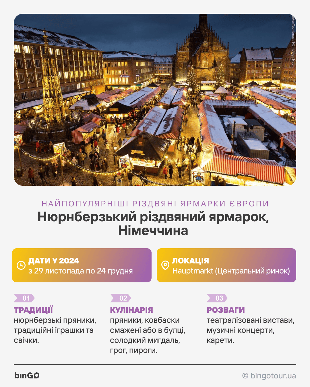 Різдвяний ярмарок в Нюрнберзі є найбільшим та найвідомішим у Німеччині і бере свій початок з 1628 року. Він складається зі 180 будиночків, обтягнутих біло-червоним полотном, та освітлених алей між ними.