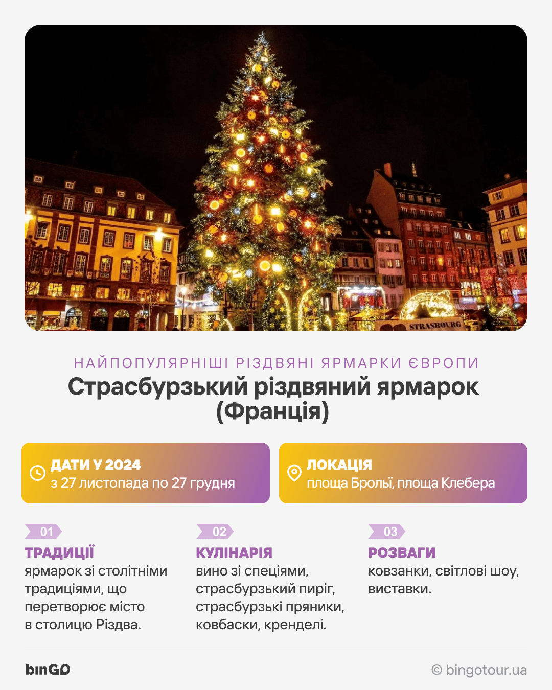 У Страсбурзі ви можете придбати ельзаські різдвяні прикраси з дерева, розписані вручну, сходити на ковзанку, малечу відвести в Дитяче село, побачити ялинку на площі Клебера. Тут відбувається купа заходів на будь-який смак, а місто одягнене в кольорову ілюмінацію, вогники та гірлянди. Ще тут відбуваються художні виставки, а місцеві дизайнери на окремому ринку виставляють свої вироби.