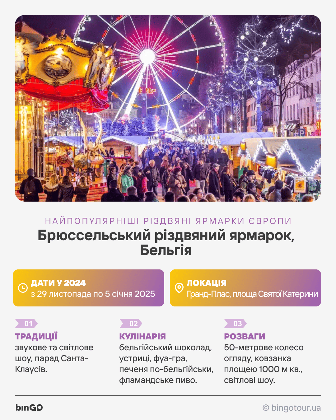 Тут ви можете покататися на 50-метровому колесі огляду або на ковзанці площею 1000 м кв. Обов’язково подивіться світлове шоу на площі Гранд-Плас і на фасаді церкви Святої Катерини. Звісно, тут дуже широкий вибір товарів - від сучасних виробів до автентичних витворів, які власноруч роблять місцеві майстри.