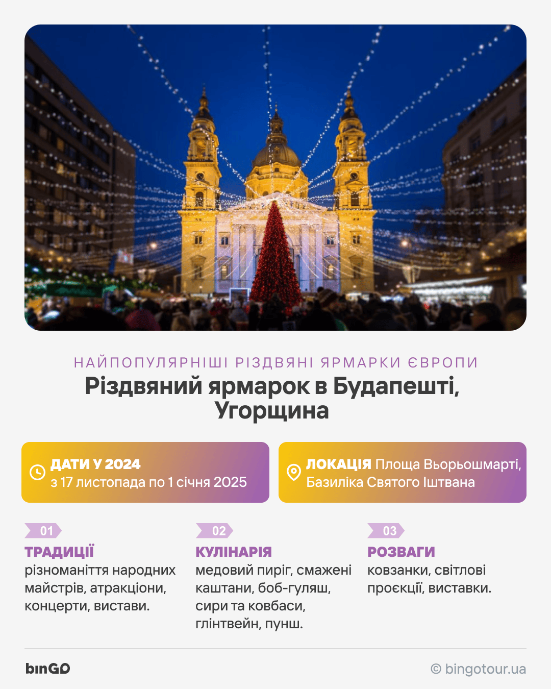 Дати у 2024 році: Різдвяний ярмарок Будапешту проходитиме з 17 листопада по 1 січня 2025 року.